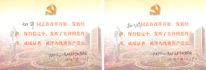2010年6月,姚舜、杨文娟被中共武昌区工商联会员企业委员会评为“优秀共产党员”
